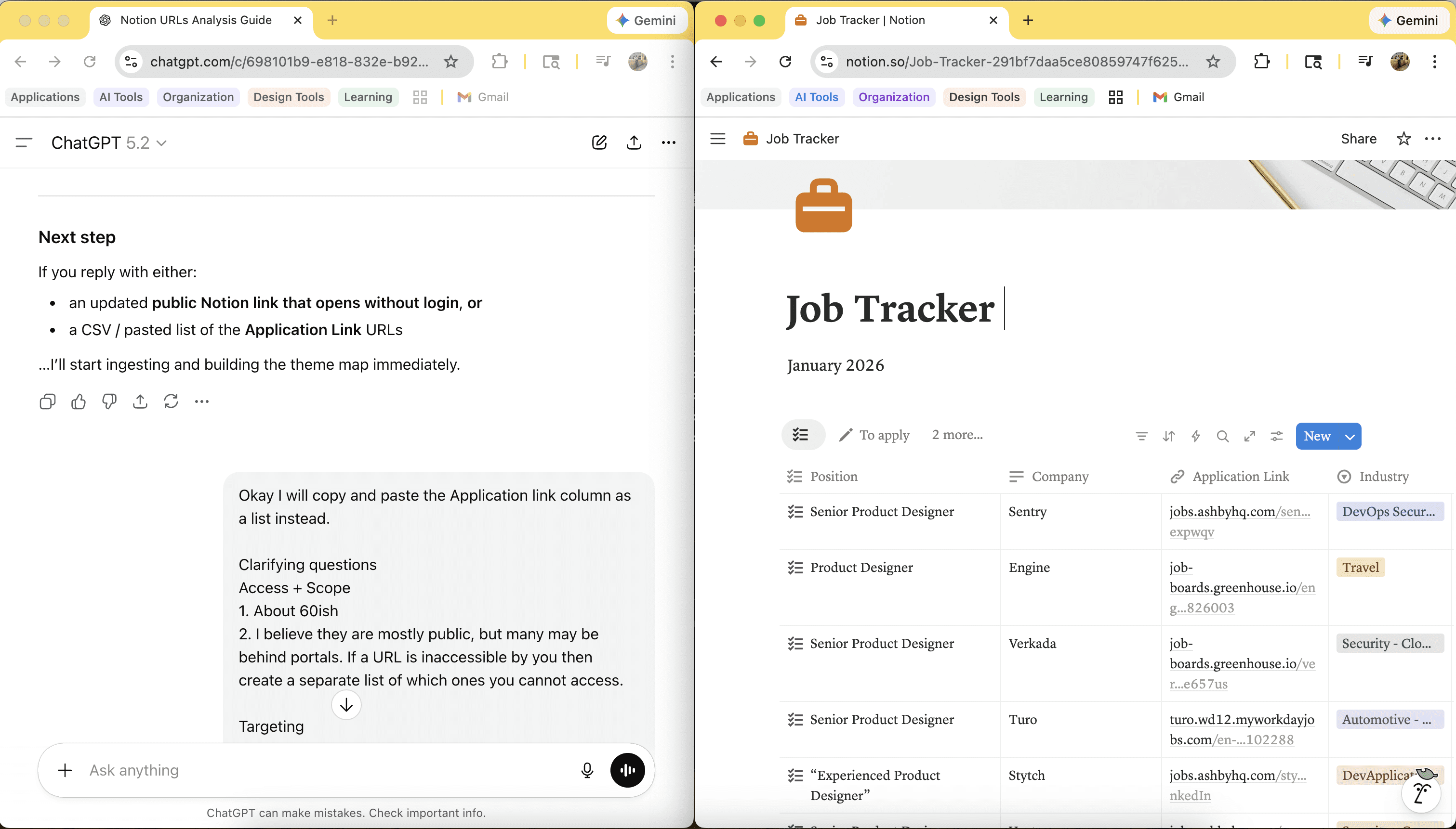 60+ relevant job descriptions URLs added into ChatGPT prompted to target most common themes to promote in the first view of my portfolio.