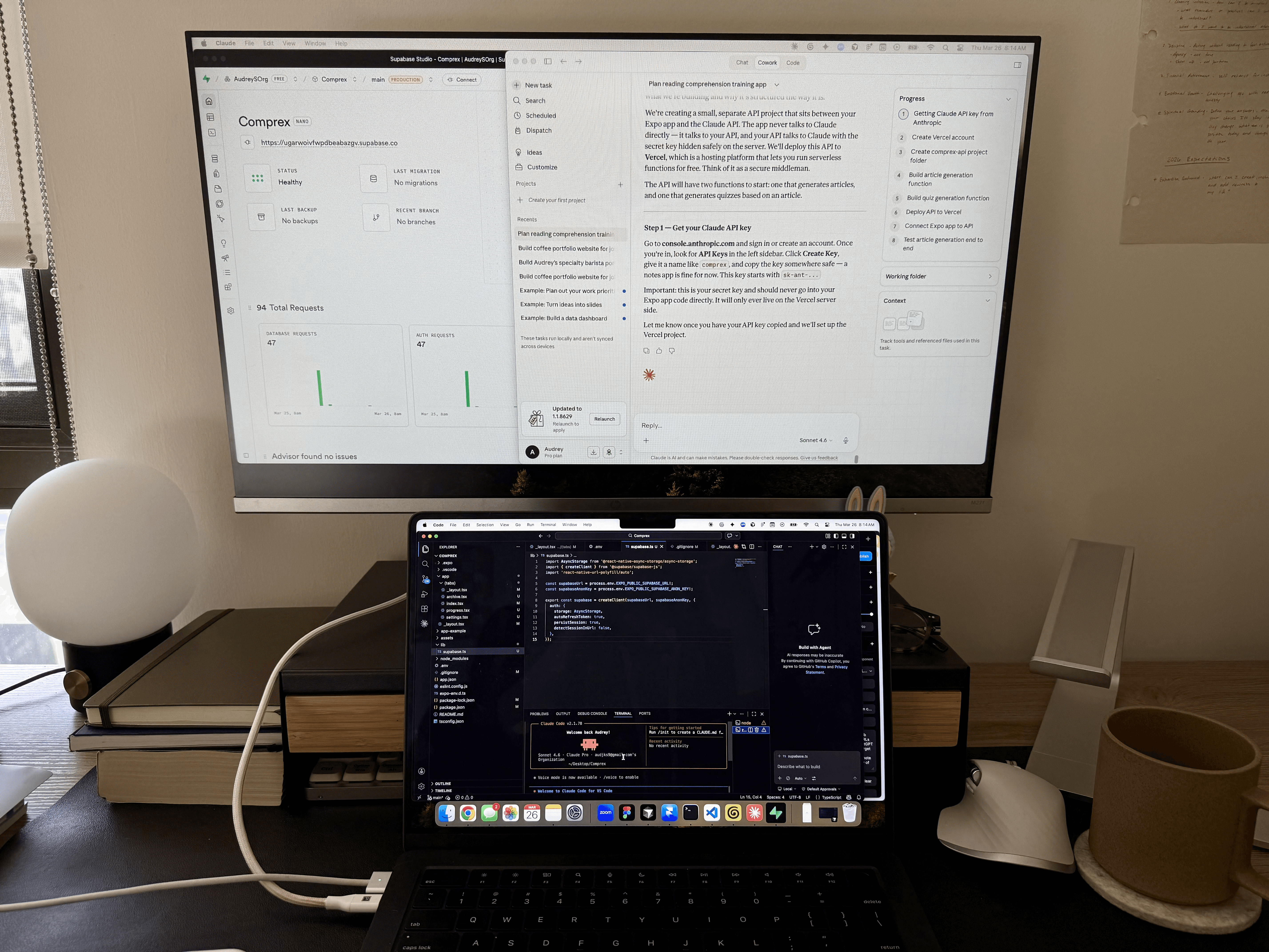 concept to code → VS Code testing on-device → Expo Go building out data models → Supabase hosting app demonstration → Appetize.io Learnings: Distributed systems have a lot of failure points. A single reading session touched the Expo app, a Vercel serverless function, the Anthropic API, and Supabase and any of these can fail at a given time. I learned to trace errors across all of them, not just look at the app itself.